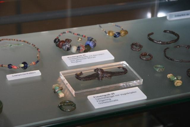 Die Vitrine 1 zeigt Schmuckstücke von Frauen der Völkerwanderungszeit. Eiserne Gegenstände hatten im Denken der Menschen eine übelabwehrende Bedeutung. Eiserne Schlüssel etwa schenkte man den Frauen als Amulett zur Erleichterung der Geburt. Die Beigaben von Spinnwirtel etwa sind ein Hinweis auf die Wollarbeit, die als tugendhafte Tätigkeit galt. Beliebt waren auch Schmuckgegenstände aus Glas, vor allem Glasperlenketten, Ohrringe mit Glaseinlagen oder kleine Glasgefäße zur Aufbewahrung wohlriechender Düfte.